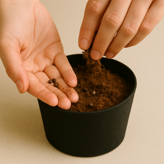 - Semer 4 à 5 graines dans de petits trous à 1 cm de surface (environ 15 graines pour un pot de 1 Litre) et recouvrir légèrement.